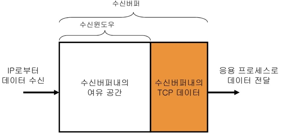 - 수신 TCP는 자신의 수신 버퍼 내의 여유 공간의 크기를 송신 TCP에게 통지하고, 송신 TCP는 통지된 여유 공간의 크기보다 적은 양의 데이터를 송신