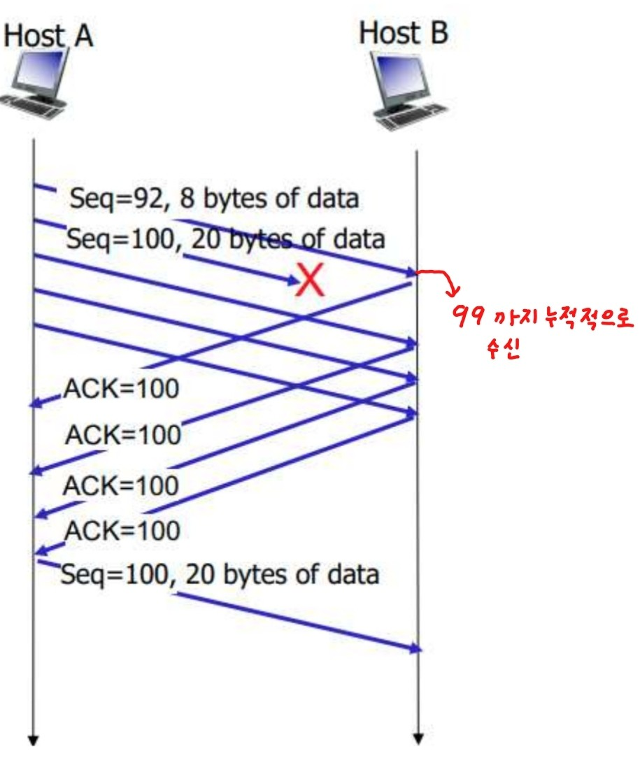 - 3개 중복 ACK 도착하면 Timeout과 무관하게 누적 수신 확인 다음 세그먼트 재전송