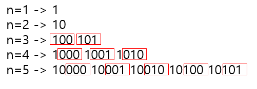 - n=5 -> 10000 10001 10010 10100 10101