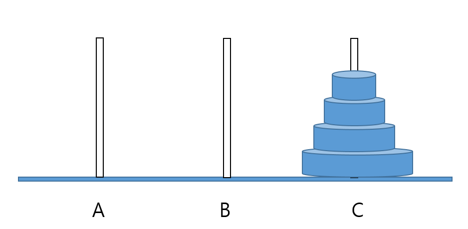 세 개의 장대가 있고 첫 번째 장대에는 반경이 서로 다른 n개의 원판이 쌓여 있다. 각 원판은 반경이 큰 순서대로 쌓여있다. 이제 수도승들이 다음 규칙에 따라 첫 번째 장대에서 세 번째 장대로 옮기려 한다.
