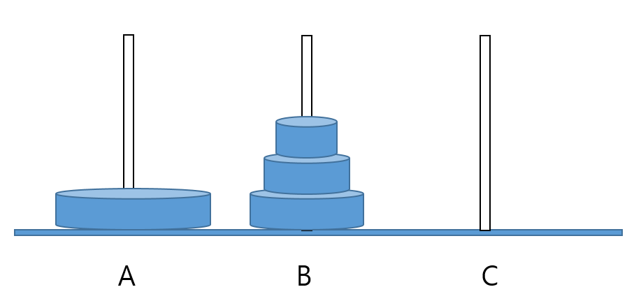 - 한 번에 한 개의 원판만을 다른 탑으로 옮길 수 있다.