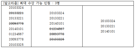 위의 표는 최대 수강 가능 인원이 3명인 알고리즘 수업에 대해 6명의 학생이 수강신청을 진행한 모습이다. 버튼이 비활성화 된 후, 먼저 규칙 1을 적용하여 클릭을 2번 이상 한 학생의 중복된 대기목록을 삭제한다. 중복된 목록을 제거한 후, 맨 앞에서부터 최대 수강 가능 인원인 3명을 선정한다. 표의 맨 오른쪽에는 그 최종결과를 나타낸 모습이다. 이와 같은 방법을 이용하여 최종적으로 수강신청에 성공한 인원을 출력하는 프로그램을 작성하시오.