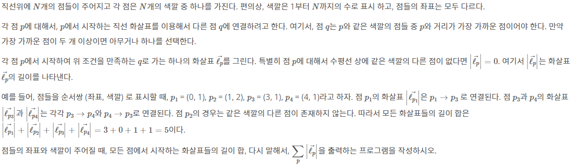 직선위에 $N$개의 점들이 주어지고 각 점은 $N$개의 색깔 중 하나를 가진다. 편의상, 색깔은 1부터 $N$까지의 수로 표시 하고, 점들의 좌표는 모두 다르다. 각 점 $p$에 대해서, $p$에서 시작하는 직선