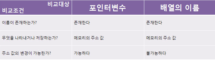 포인터 변수와 배열의 이름을 비교해보면 다음과 같다.