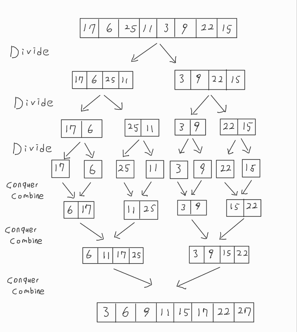 구체적인 방법을 알아보면, 하나의 리스트를 두 개의 균등한 크기로 분할, 정렬한 후, 정렬된 두 리스트를 합하여 하나의 정렬된 리스트가 되게 하는 것이다.