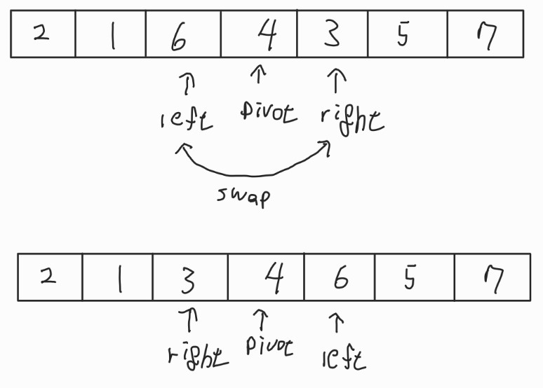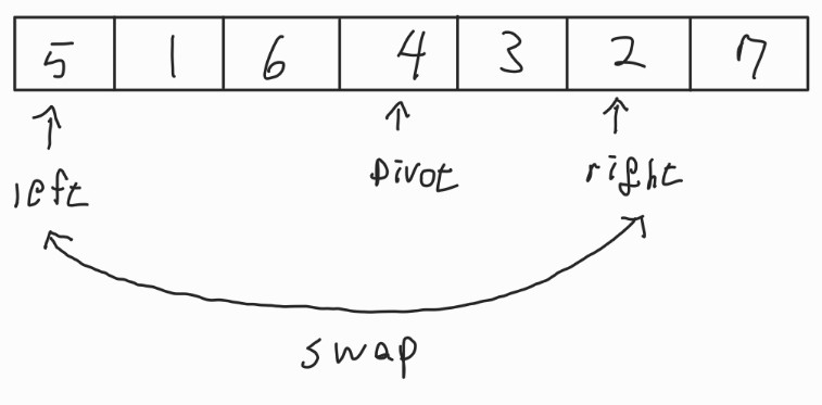 - 이 배열에서 left는 5가 4보다 크므로 움직이지 않고, right는 2가 4보다 작으므로 멈춘다.