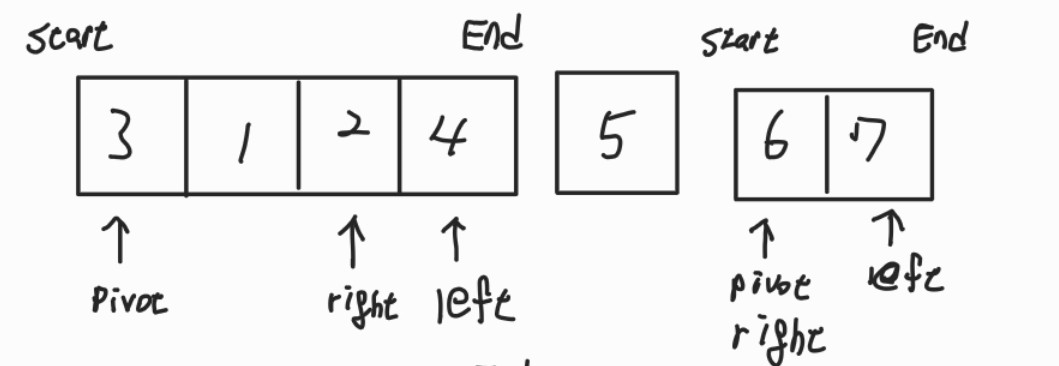 right가 left보다 커졌기 때문에 반복문을 종료하고 right를 기준으로 start ~ right-1, right+1 ~ end의 두 배열로 분할한다.