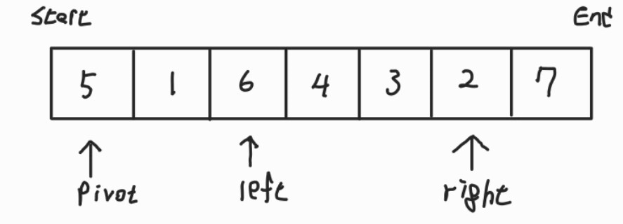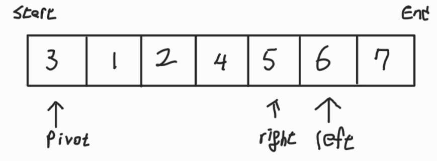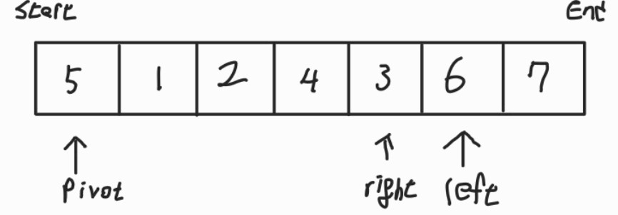 맨 앞의 원소를 pivot으로 하고, left를 pivot의 한칸 뒤 원소로 잡는다. 또한 right는 맨 뒤의 원소로 잡는다.
