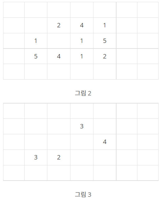 지구 온난화로 인하여 북극의 빙산이 녹고 있다. 빙산을 그림 1과 같이 2차원 배열에 표시한다고 하자. 빙산의 각 부분별 높이 정보는 배열의 각 칸에 양의 정수로 저장된다. 빙산 이외의 바다에 해당되는 칸에는 0이 저장된다. 그림 1에서 빈칸은 모두 0으로 채워져 있다고 생각한다.