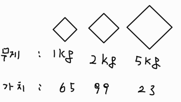 처음으로 2kg 가방에는 (1kg, 65)인 보석과 (2kg, 99)인 보석이 들어갈 수 있다.
