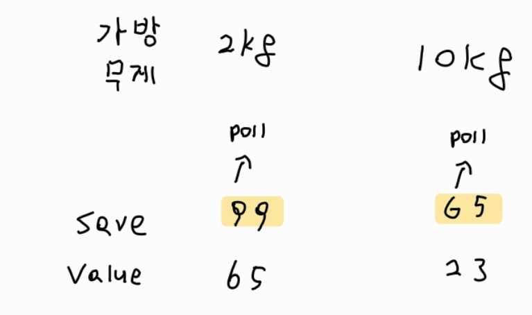 이때 가장 큰 가격이 있는 보석은 (2kg, 99)이므로 이 보석을 2kg 가방에 넣는다.