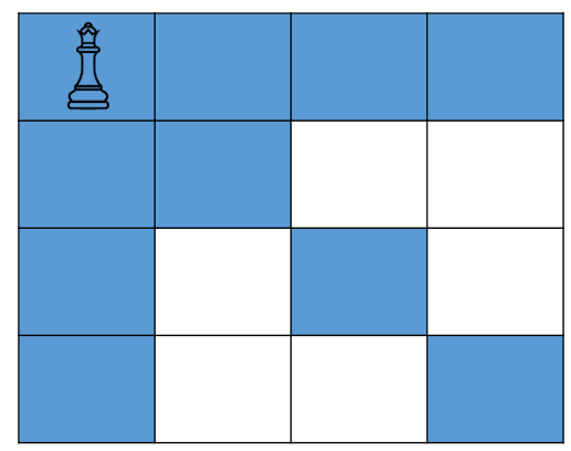 위와 같이 (0, 0)의 좌표에 퀸이 있을 때 파란색으로 색칠되있는 칸에는 퀸을 놓을 수 없다.