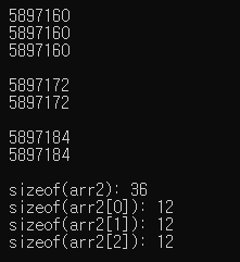 arr2에 sizeof() 함수를 사용했더니 배열 전체의 크기를 반환하였고, 나머지 arr2[0], arr2[1], aarr2[2]의 경우, 각 행의 크기만을 반환했다.