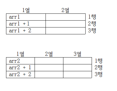 이는 "배열이름 arr이 가리키는 대상은 int형 변수이고, 포인터 연산 시 실제로 (sizeof(int) * 4(가로의 길이))의 크기만큼 증감하는 포인터 형이다."라고 해야 한다.