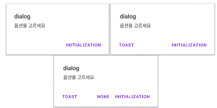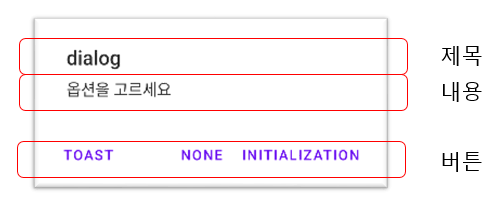 - DIALOG버튼: Toast, None, Initailization 3개의 버튼을 가지고 있다.