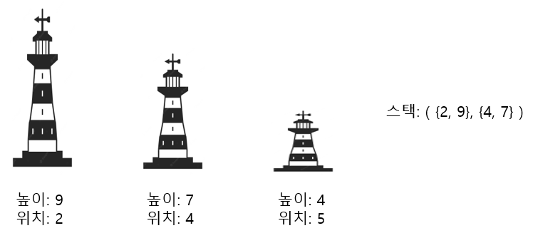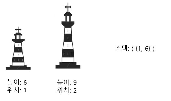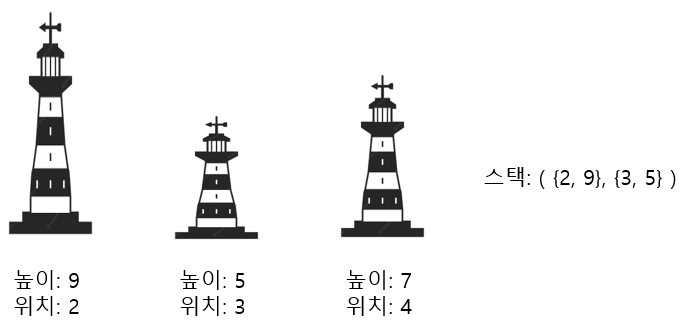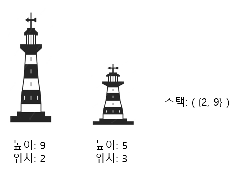 또한 이후로 나올 탑이 높이가 9보다 작다면 2번 탑에서 신호를 받게 되고, 9보다 크다면, 1번 탑 또한 신호를 받을 수 없기 때문에 1번 탑은 더 이상 신경쓰지 않아도 된다.