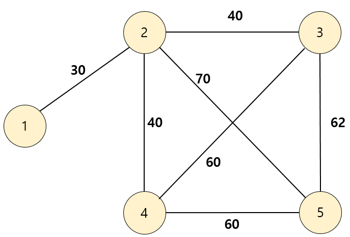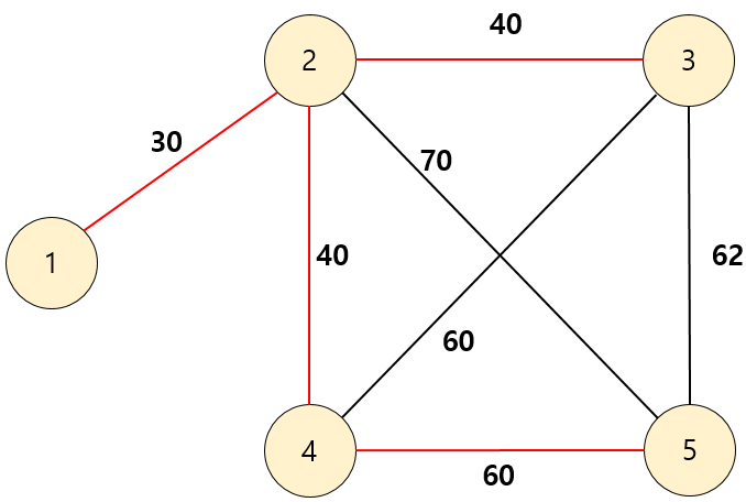이제 여기서 최소신장 트리를 구하면 시작 나라와 마지막 나라가 같은 경로이며 이때의 최소 비용을 구할 수 있다.
