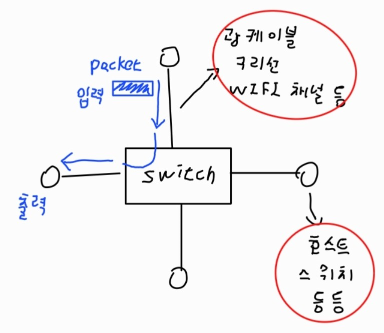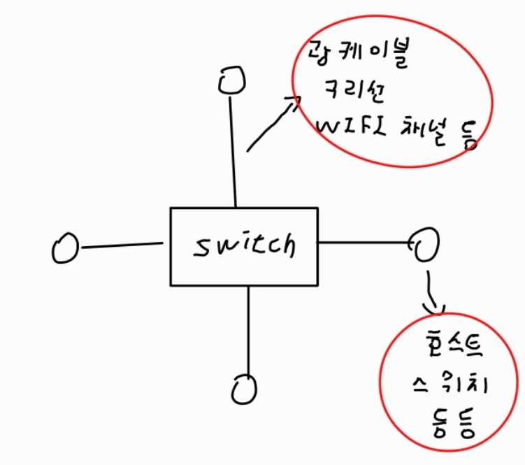 - 다수의 통신 장치를 통신 링크로 연결하는 장치 -> 호스트가 연결될 수도 있고, 또 다른 스위치를 연결할 수도 있다.
