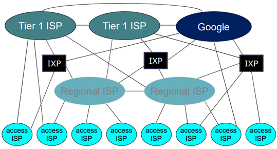 - Regional ISP를 상호 연결하는 Tier-1 ISP, 한 나라 안에서 연결하는 인터넷 서비스를 제공하는 ISP