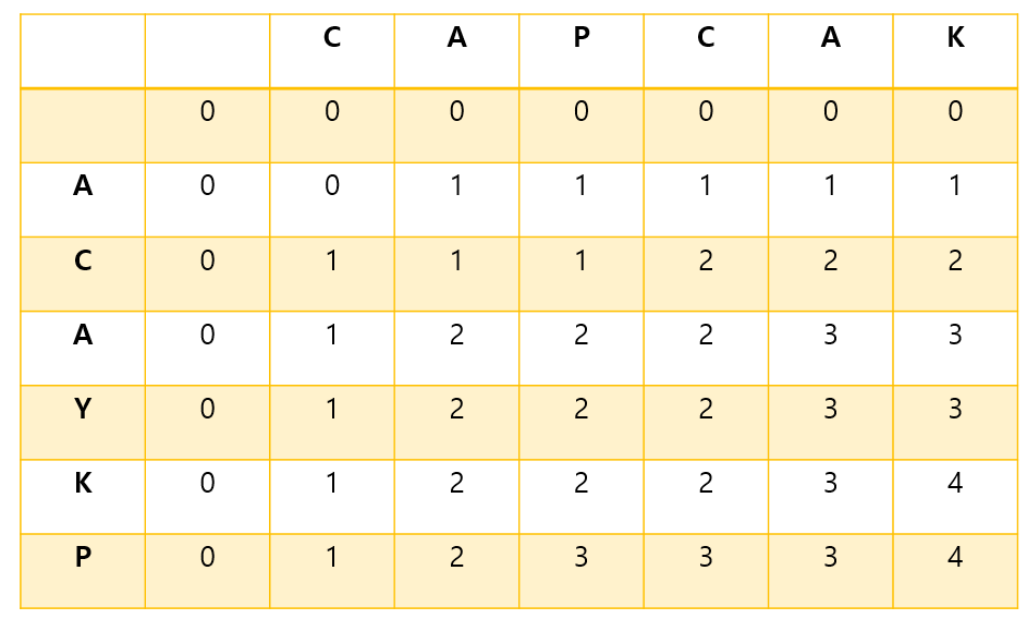- 같지 않다면, dp[i-1][j]와 dp[i][j-1] 중 더 큰 값이 더 긴 부분 수열을 의미하므로 더 큰 값을 갖게 된다.
