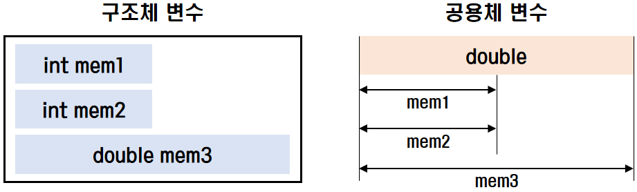 공용체 변수가 선언되면 공영체를 구성하는 멤버는 각각 할당이 아닌 그중 가장 크기가 큰 멤버의 변수만 하나 할당되어 이를 공유한다.