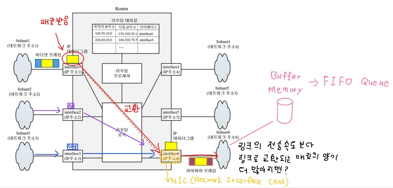 - 출발지와 각 라우터에서 전송 지연시간 발생