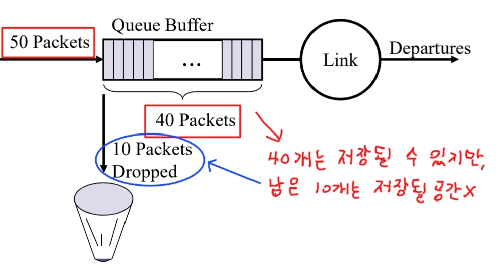 - 유연한 크기의 버퍼 메모리에 저장될 수 없을 만큼 많은 양의 패킷이 해당 링크로 교환될 때 발생한다.