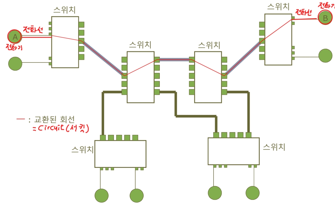 - 회선 교환 작업을 일련의 스위치에서 반복하여 종단 장치를 일정 전송 속도의 전용 회선으로 연결