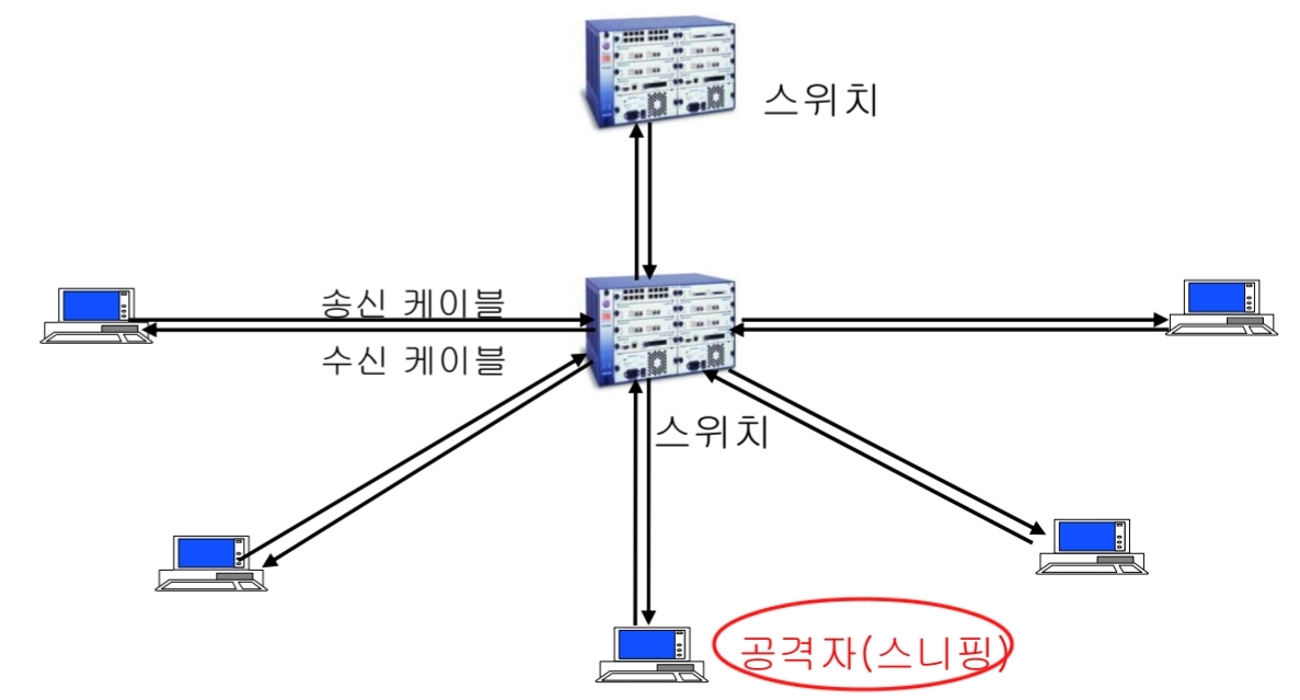 - 네트워크를 통과하는 데이터 트래픽을 분석하고 기록하여 IP 주소, 사용자 ID, 패스워드 등 민감한 정보를 가로채는 공격