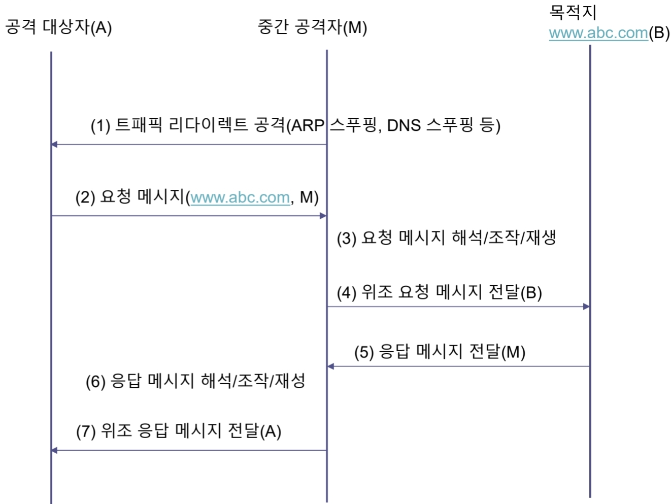 - 공격자가 공격 대상자가 목적지로 보내는 트래픽을 가로챈다.