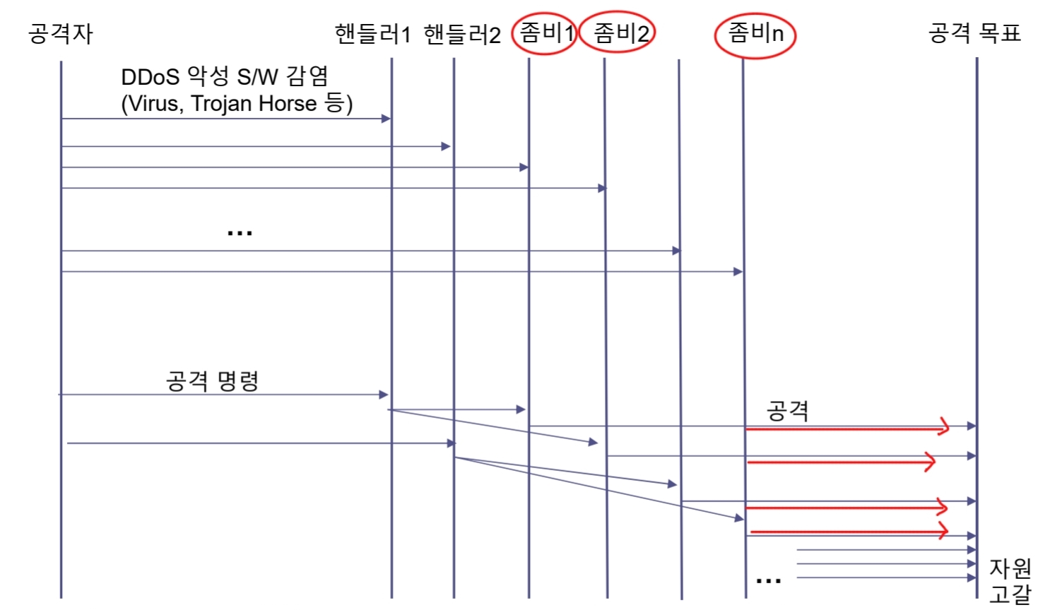 - 목표를 보다 효과적으로 공격하고 공격 사실 추적을 어렵게 하기 위해 분산된 다수의 컴퓨터를 동원하여 수행하는 DoS 공격