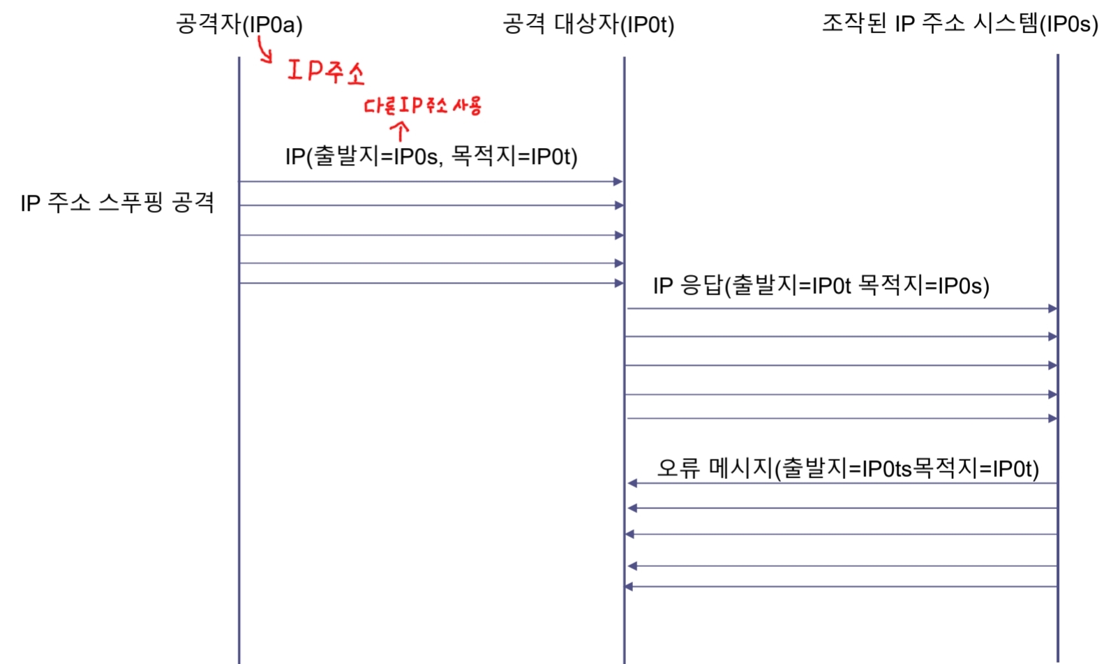 - 공격자(IP주소는 IP0a)가 공격 대상자(IP0t)를 공격하는데, 출발자 IP주소가 IP0s(조작된 IP주소)를 이용하여 공격