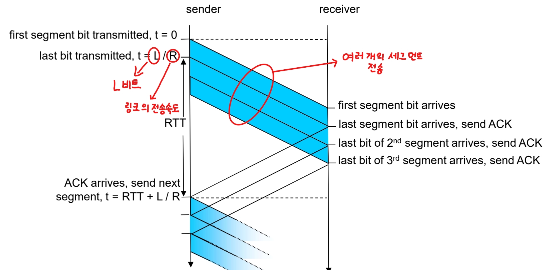 - Stop-and-Wait는 segment를 보내고 Ack이 올 때까지 기다려 그 시간 동안 링크를 비워둔다. 따라서 링크 효율의 떨어진다.