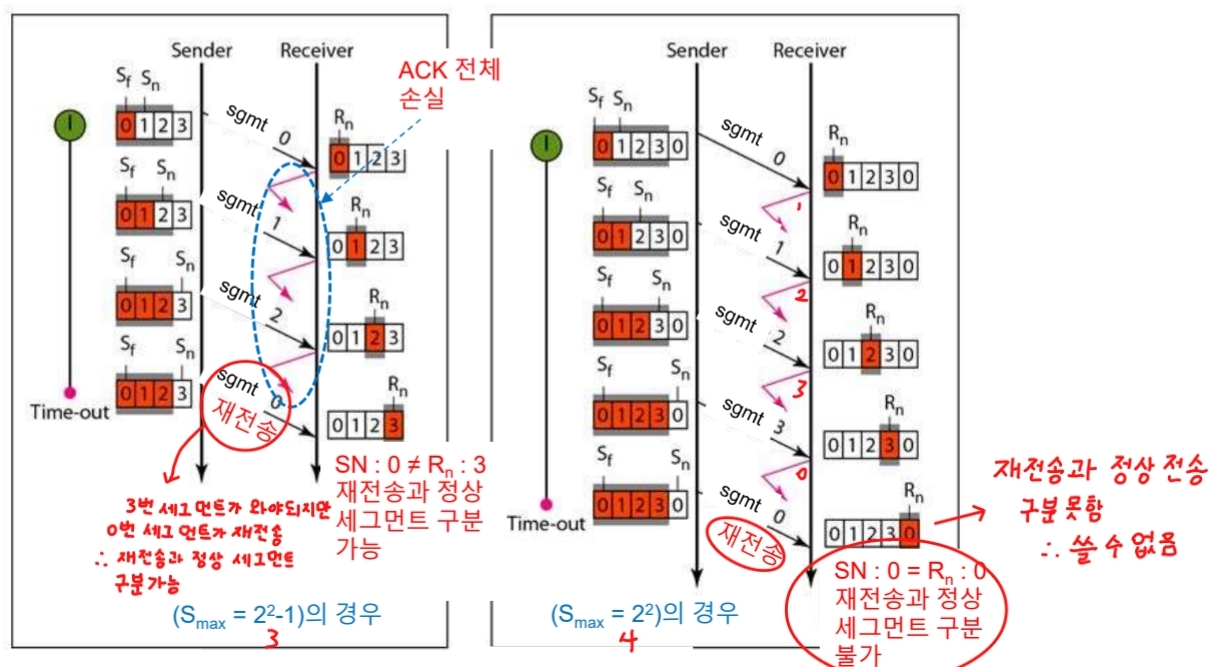 - 순서번호(SN) 필드 크기가 m비트일 때 송신 윈도우 최대 크기(Smax -> Ssize랑 같은 말이다.) -> 2m - 1