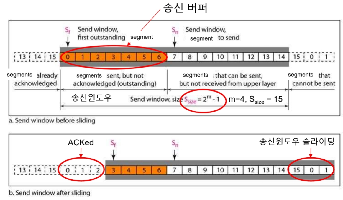 - ACK가 수신되면 해당 세그먼트를 버퍼에서 제거하고, 송신 가능 순서번호 범위를 1씩 이동한다.(송신 윈도우 슬라이딩)
