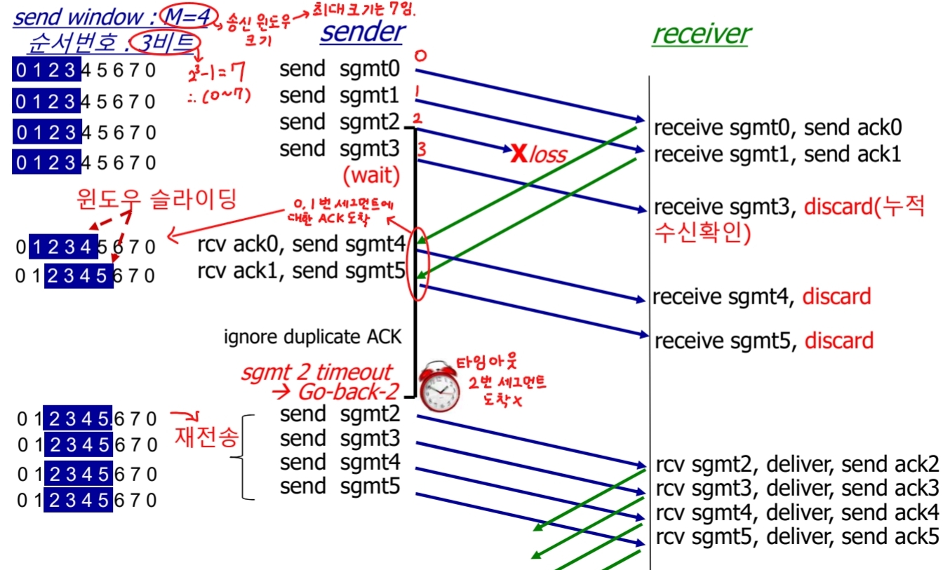 - 세그먼트 재전송 타이머가 종료될 때까지 ACK가 수신되지 않으면 해당 세그먼트부터 송신 윈도우의 모든 세그먼트를 재전송한다.