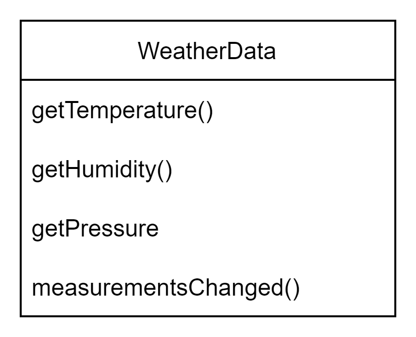 위와 같이 WeatherData 클래스가 있을 때 온도, 습도, 기압 메서드는 계속해서 새로운 정보를 준다고 하자.