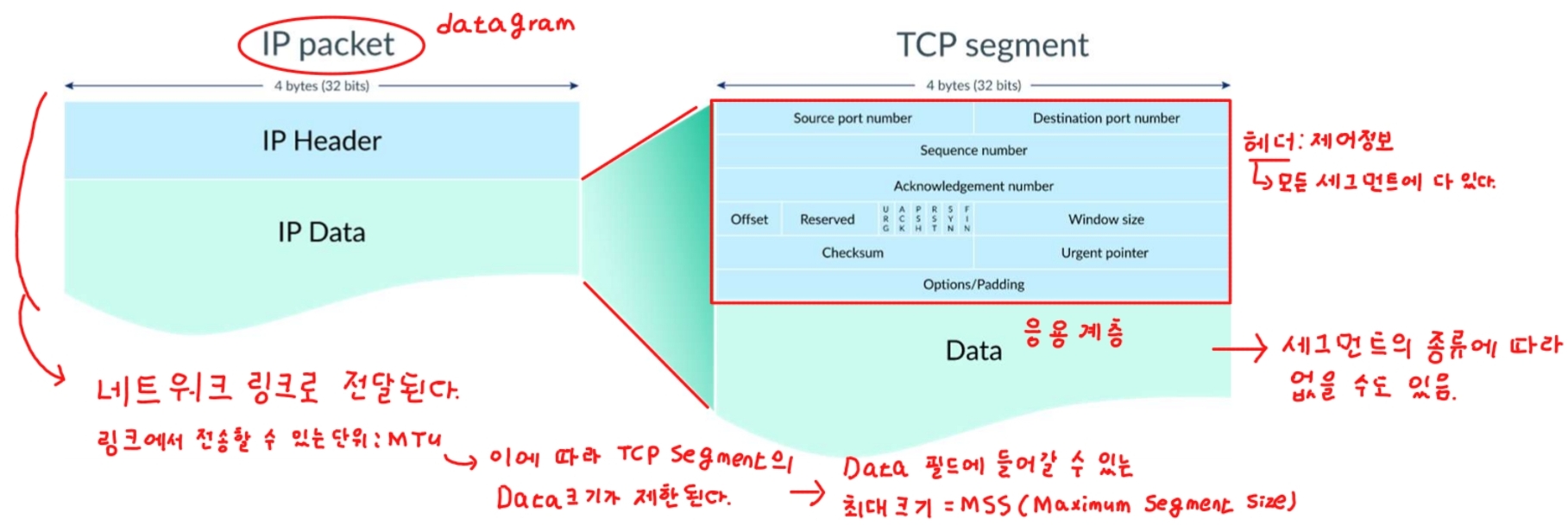 - TCP 헤더 크기 + IP 헤더 크기 + MSS <= MTU