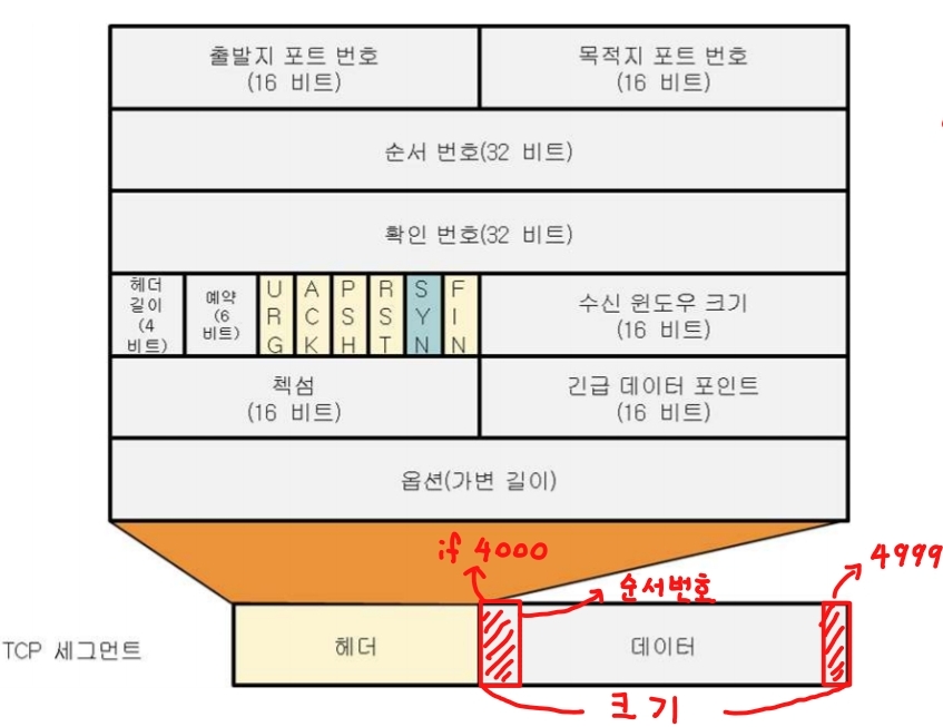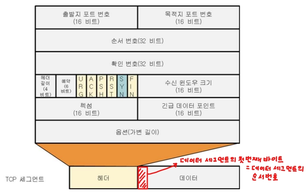 - 번호 부여 원칙: 시작 순서 번호(ISN)부터 이미 송신된 바이트의 다음 바이트 번호(데이터의 첫 번째 바이트 번호)