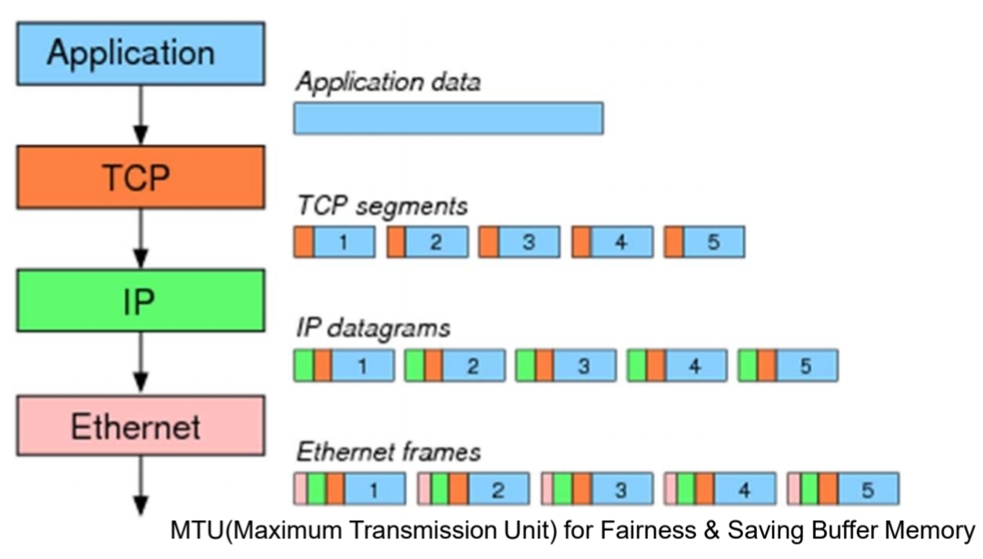 - 데이터 링크의 MTU(최대 전송 단위, Maximum Transmission Unit)에 의해 결정(ex. 유선 LAN MTU = 1500 바이트)