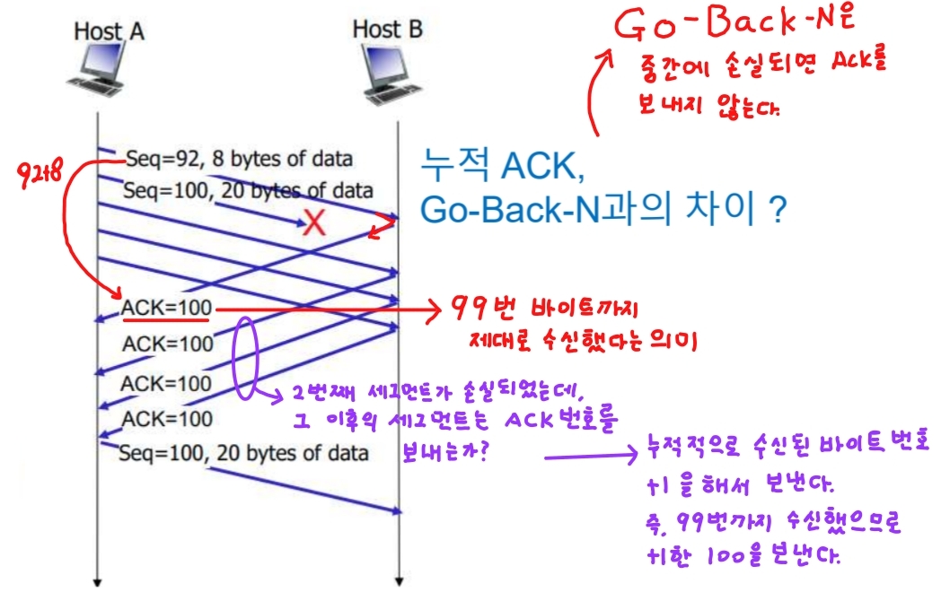 - 번호 부여 원칙: 순서(Byte의 순서)대로 수신된 세그먼트의 마지막 바이트의 다음 바이트 번호(수신을 기대하는 세그먼트의 순서 번호), 세그먼트 수신자에 의해 부여된다. (ACK 세그먼트를 통해 전달)