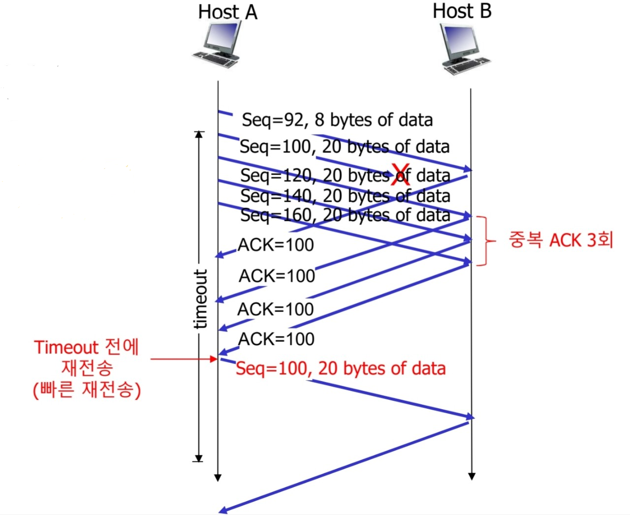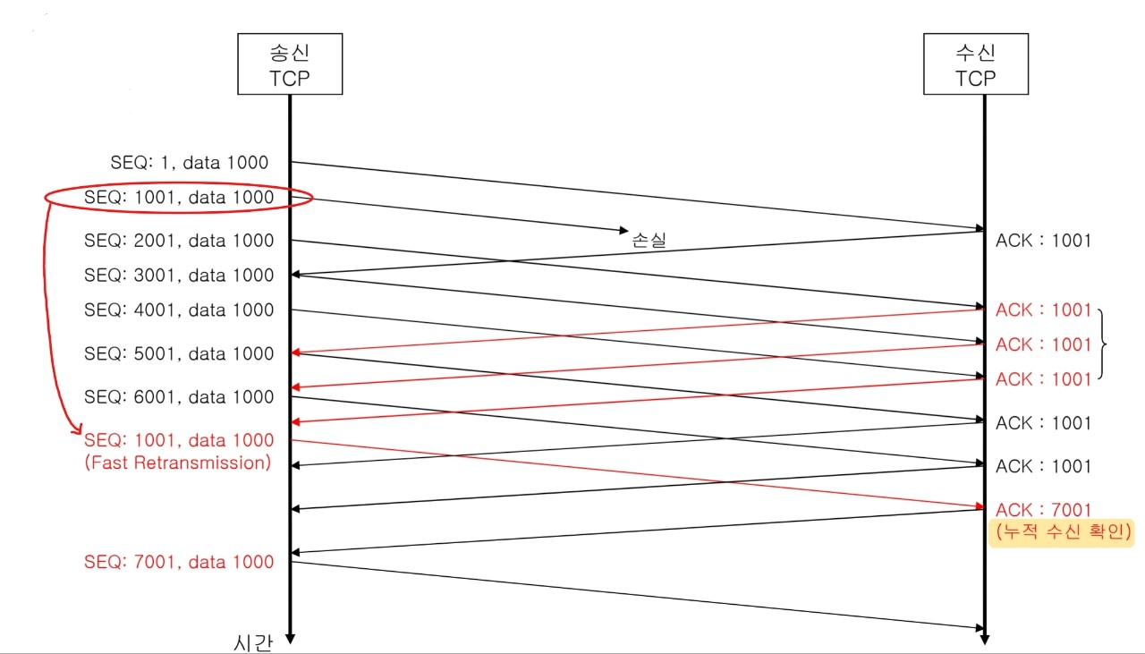 - 3개 중복 ACK 도착하면 Timeout과 무관하게 누적 수신 확인 다음 세그먼트 재전송