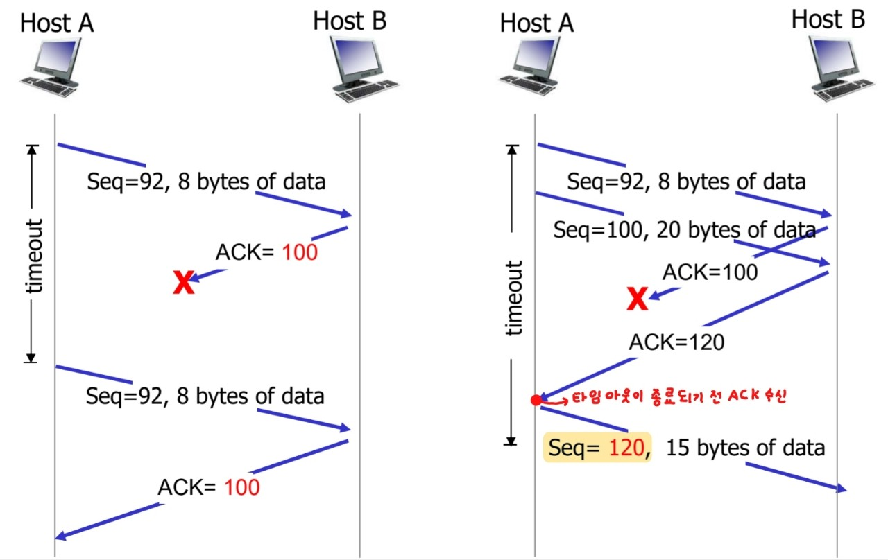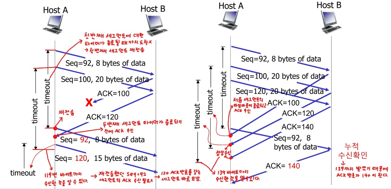 - Timeout동안 누적 ACK 미수신 세그먼트 재전송