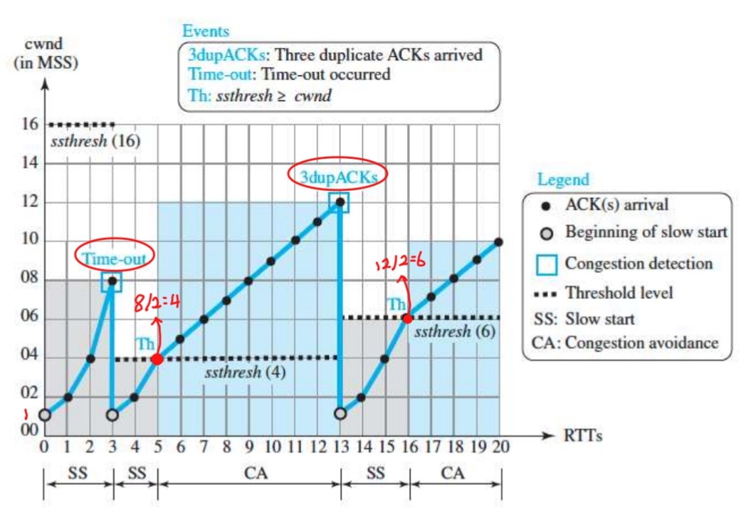 - Timeout과 3 duplicate ACK(3개 중복 ACK)를 동일하게 처리한다.