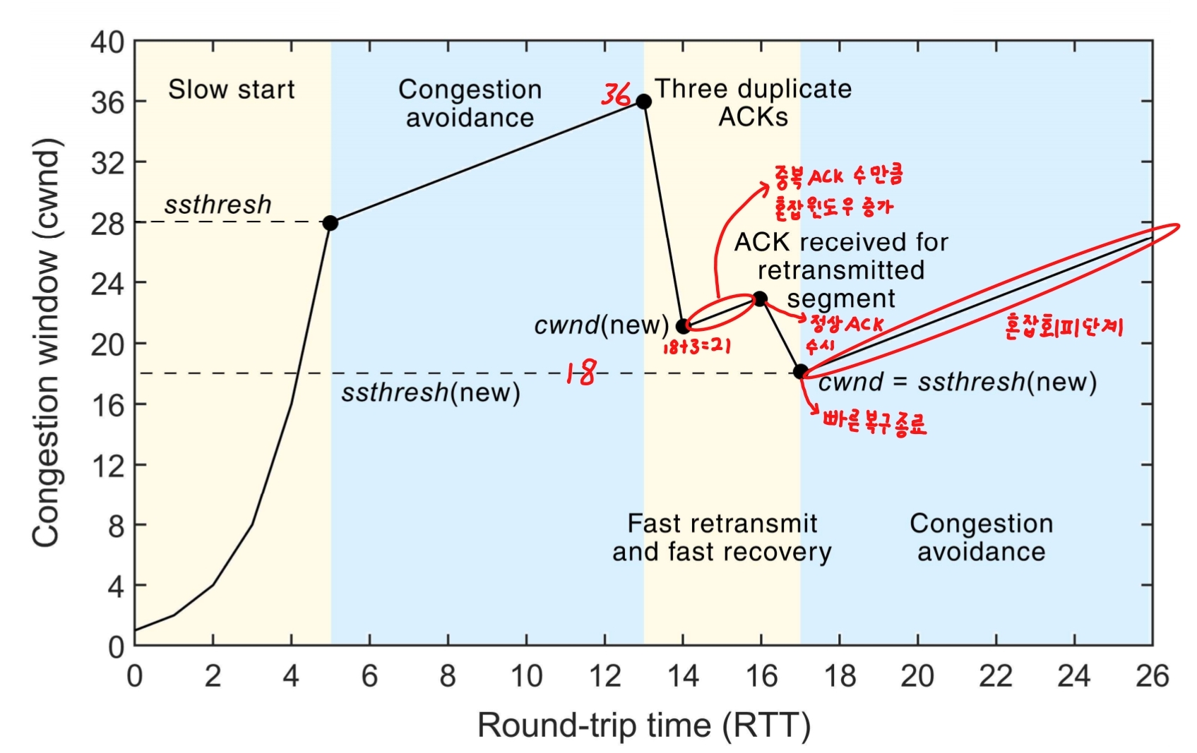 - 3개 중복 ACK 발생 시 빠른 회복 알고리즘 적용