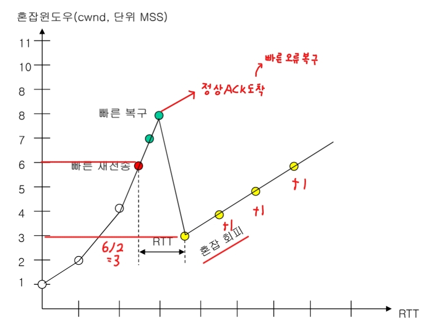 - 정상 ACK가 수신되어 오류 복구가 완료되면 슬로우 스타트 구간을 건너뛰고 혼잡 회피 단계로 진입
