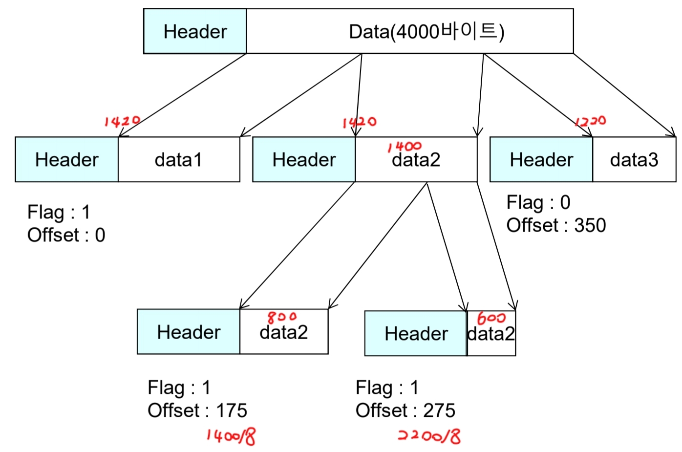 단편화 예제: MTU1 = 1420, MTU2 = 820