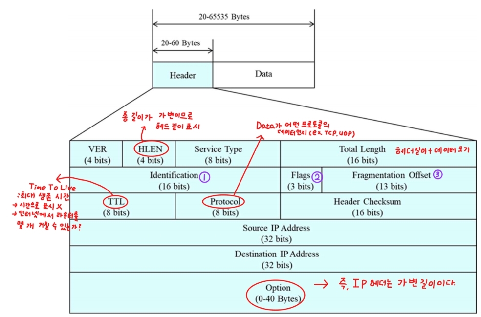 - Identification, Flags, Framentataion Offset은 IP 데이터그램의 크기가 서브넷의 데이터 전송 단위보다 커서 서브넷을 통과할 수 없을 때, 단편화를 하기 위해 사용되는 필드이다.