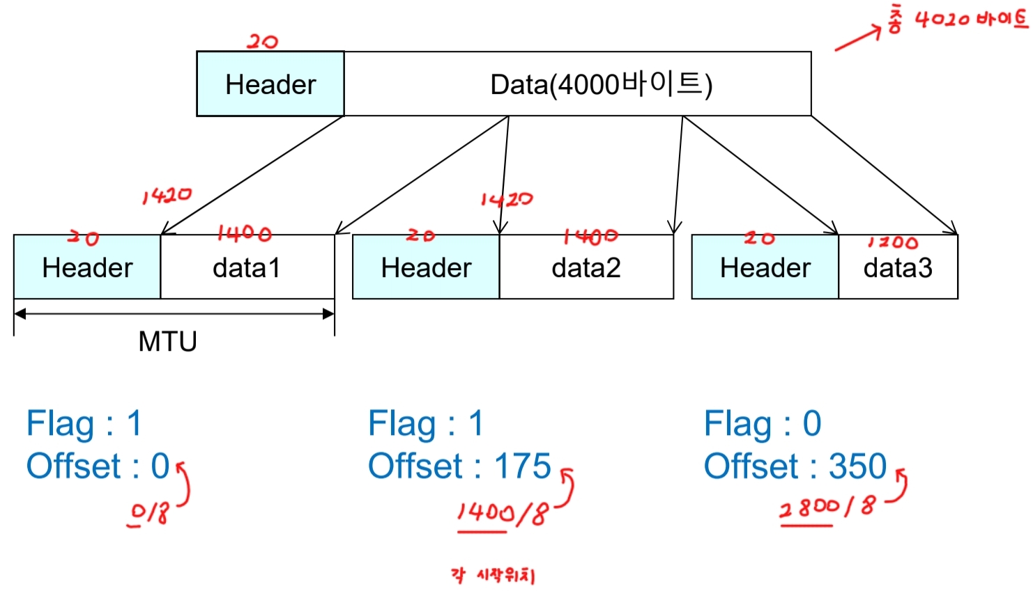 - 플래그(flags): 마지막 데이터그램은 0, 나머지는 1
