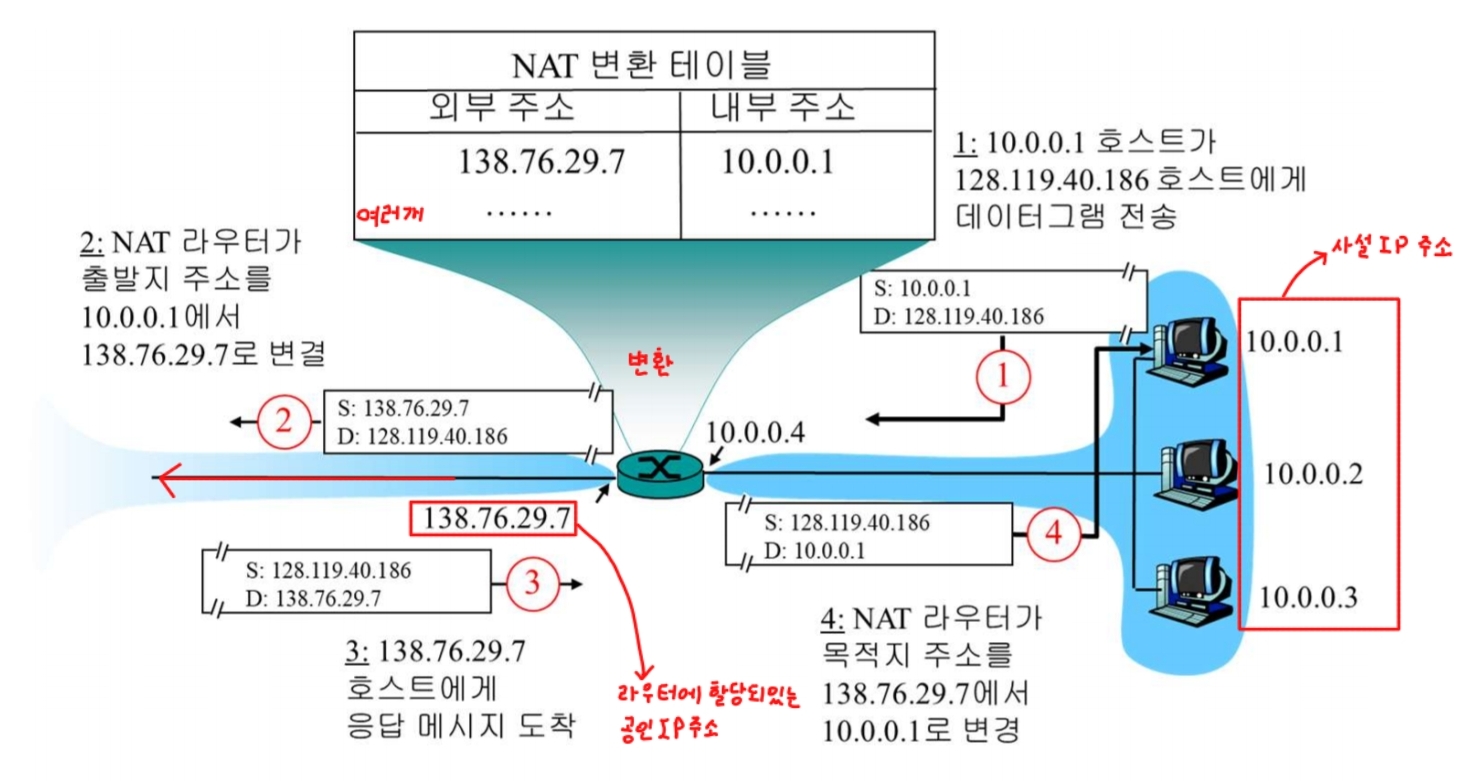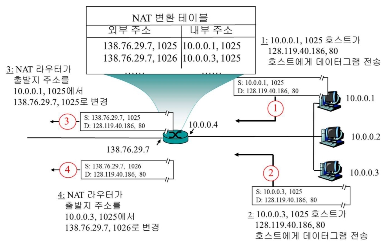 - 역할: 사설 네트워크에 연결된 호스트의 사설 IP 주소와 인터넷의 공인 IP 주소 간의 변환 프로토콜